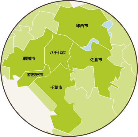 八千代市を中心に船橋市、佐倉市、印西市、習志野市、千葉市(花見川区、稲沢区、中央区)上記以外の地域はお問い合わせフォームよりお問い合わせください。